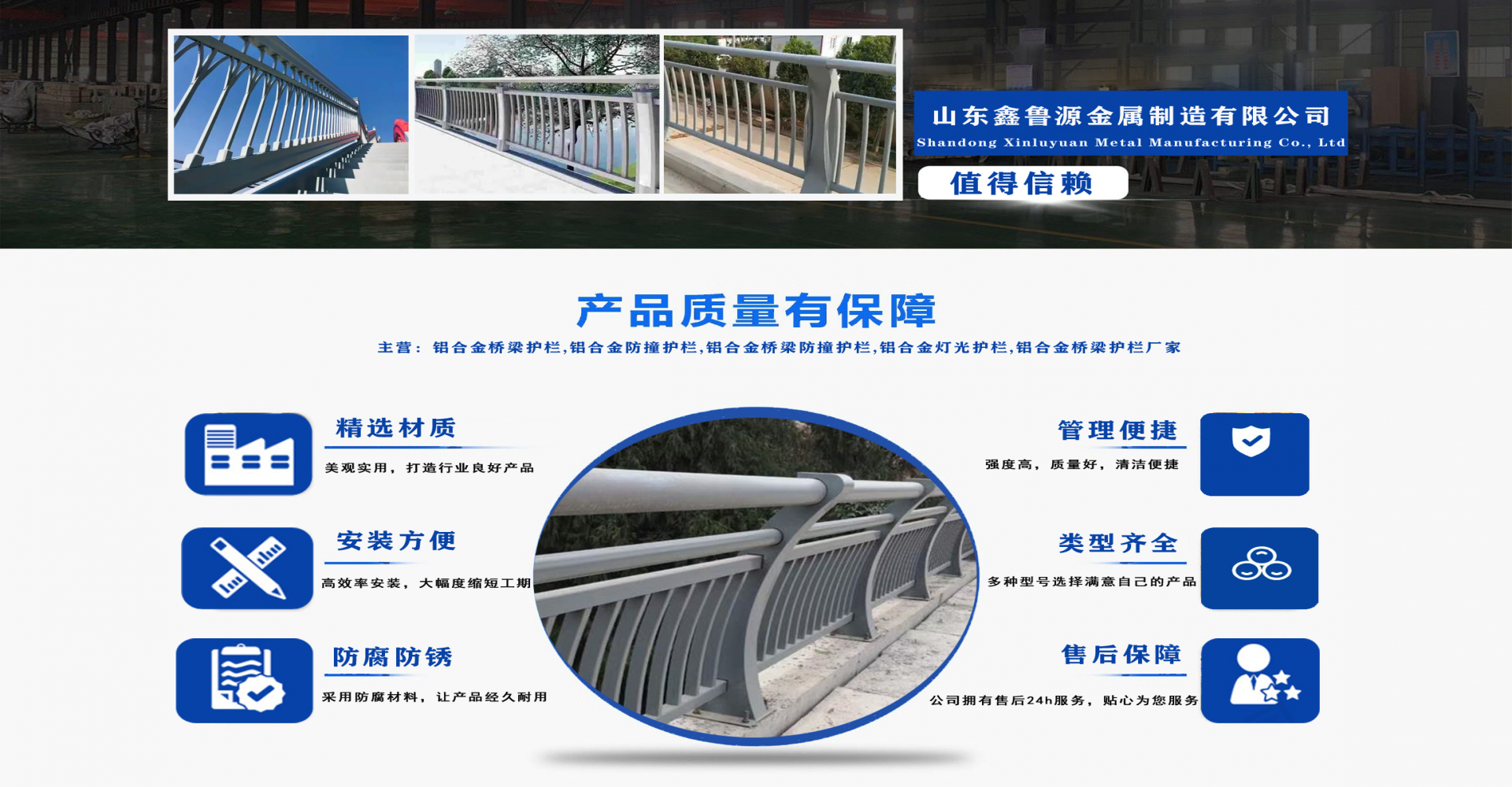 山東鑫魯源金屬制造有限公司主要經營:鋁合金橋梁護欄,鋁合金防撞護欄,鋁合金橋梁防撞護欄,鋁合金燈光護欄,不鋁合金橋梁護欄廠家,環波梁橋梁護欄,環波梁防撞護欄。質量可靠、經濟實用的顯著特點。公司為客戶提供可靠售后保障,堅持“以品質立足、服務求發展”,愿與各界朋友精誠合作、攜手發展! 服務優勢:真誠的服務理念、完善的服務體系。公司專業力量充足;工程案例眾多、從業經驗豐富;公司以可靠質量的產品,合理的價格,完善的售后服務,能夠滿足市場各個企業的需求。 企業精神:執著追求 持續創新執著追求,就是堅持不懈、堅定從容,專注于自己的事業,把能做的事情做好,不斷克服困難、把握機遇,贏得未來。 持續創新,就是生命不息、創新不止,通過持續實施技術創新、管理創新、市場創新,獲取持續的競爭優勢。...